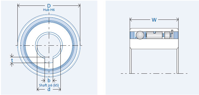 Designation | d | D | W | Tnom | nmax | Cdyn. | Cstat. | Weight | b | t | Item no. |